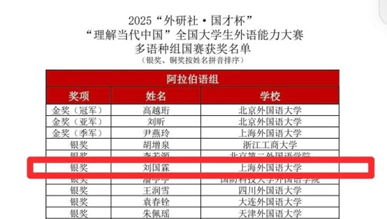 12月4至8日,2025“外研社·国才杯”“理解当代中国”全国大学生外语能力大赛在北京举行。经过激烈角逐,上海外国语大学东方语学院阿拉伯语专业2022级本科生刘国霖斩获银奖。