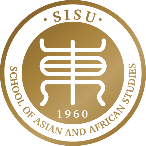 以上外校徽的主色调为基础,上部环绕上外英文校名缩写SISU,下部环绕我院英文院名School of Asian and African Studies,中间突出寓意我院的汉字钟鼎文“东”字,“东”字下方标有建院(东方语学院的前身阿拉伯语系)时间1960年)