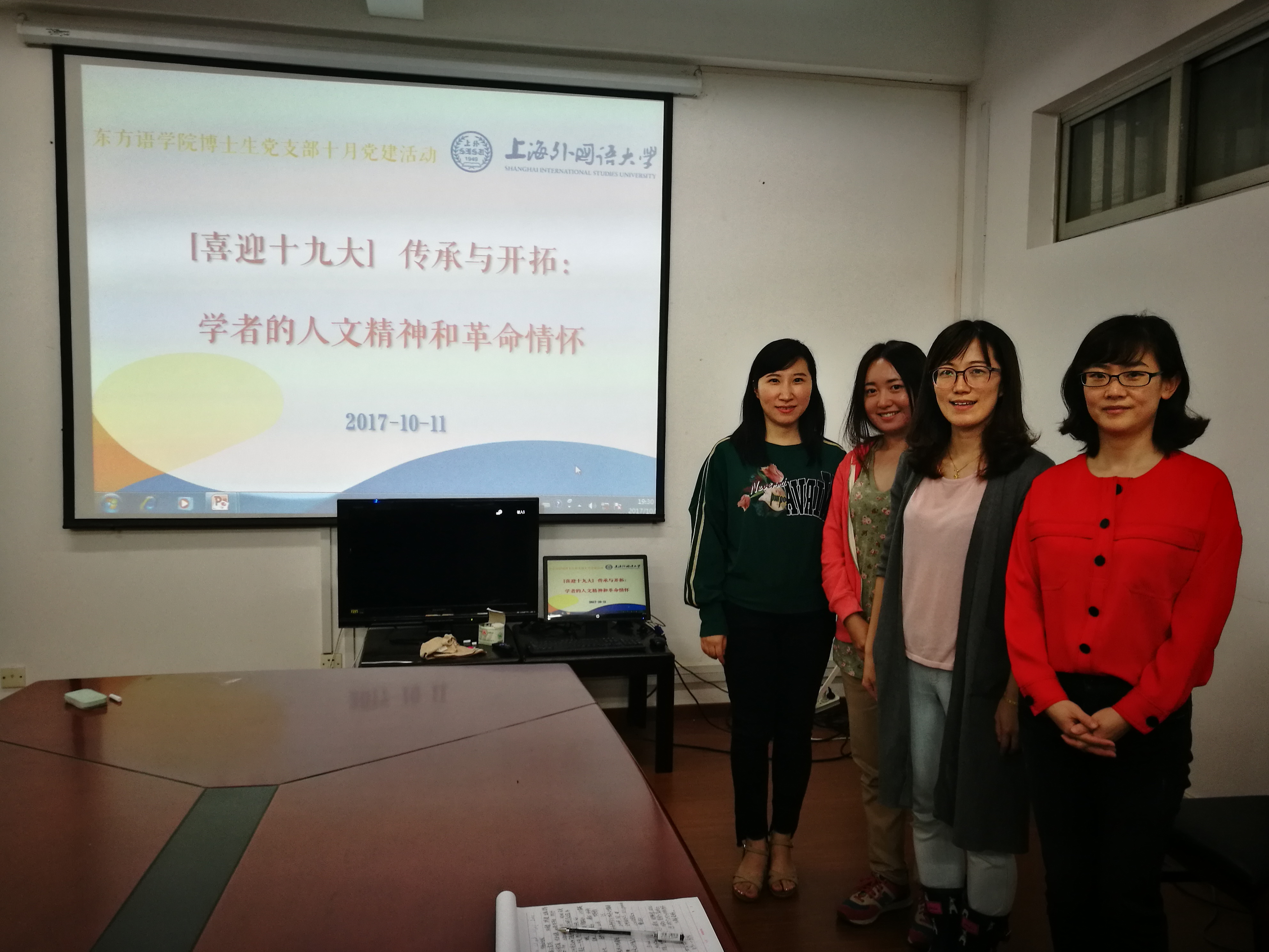 2017年10月11日,东方语学院博士生党支部在虹口一号楼226室召开全体党员大会,完成了新学期支部委员选举工作,组织开展以“传承与开拓:学者的革命精神和人文情怀”为主题的主题党日活动,喜迎十九大到来。