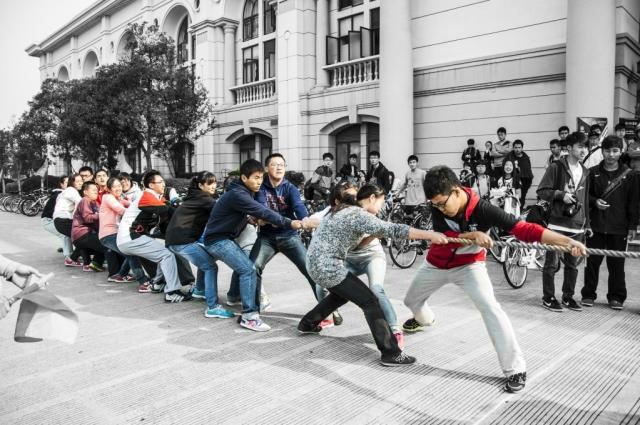 终于,你因百无聊赖而走出寝室,漫无目的地漂流到了拔河场地。像是肥皂剧中刻意安排的“偶遇”,麻绳的一端恰好是东院的队伍。“一、二、一、二”,只是瞬间,周围观众的表情好像被定格在了眼神流露失落而嘴型仍想继续呐喊的中间态上。因为输得太猝不及防。还好这只是第一局,你撇撇嘴,在心里默想,便也跟着混到助威的人群中。“加油!*他们蛋!”“Woo!”“加——油——”恍惚间,就觉得周遭的空气开始鼓动着躁动的因子,让你也渐渐变得兴奋起来。