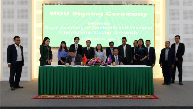 在柬埔寨皇家科学院,院长宋独(Sok Touch)院士会见代表团一行。双方就建立学生交流交换机制、教师学者交流访学机制、科研合作机制等主题开展了深入交流。双方达成共识,将在签署框架协议的基础上进一步推进实质性合作,共同为推动中柬全面战略合作伙伴关系贡献力量。会谈最后,双方签署了《中国上海外国语大学与柬埔寨皇家科学院合作谅解备忘录》。