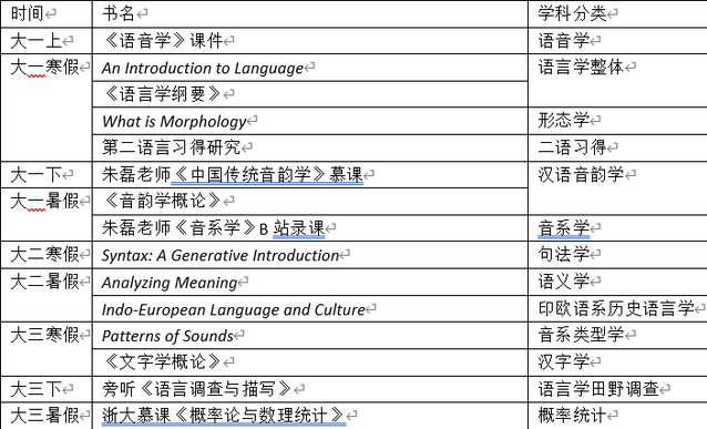 虽然没能顺利录取至梦寐以求的语言学专业,但我并没有因此停下追逐梦想的步伐。在本专业之外,我的语言学自学之路从未中断。从大一上开始,我就尝试着和语言学本科专业的同学建立联系,从对方那里获取其专业课的教材名录。在此之后,每次遇到寒假和暑假,我都会从阿语模式切换到语言学模式,通过看书籍或课程来自学。下面就根据时间顺序列举一下我看过的书目和课程: