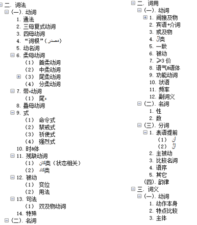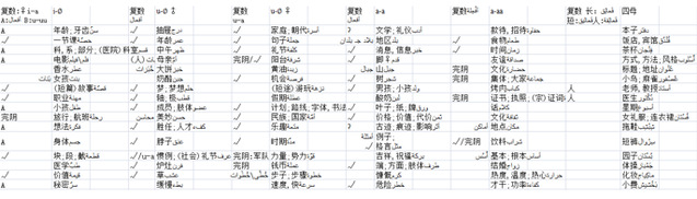 关于阿语的学习方法,在我看来,做分类笔记在我看来是非常有用的。我主要在word上整理了两个笔记,分别是《阿语语法》(3.5万字,目录的一小部分见下图左)和《阿语词汇》(4.1万字,下图右),里面记录了从大一开学以来几乎所有的语法点和词汇点,而且也非常便于检索和整理;与此同时,所有学过的单词则按词式分门别类整理在excel文件中(其中名词的一小部分见下下图)。